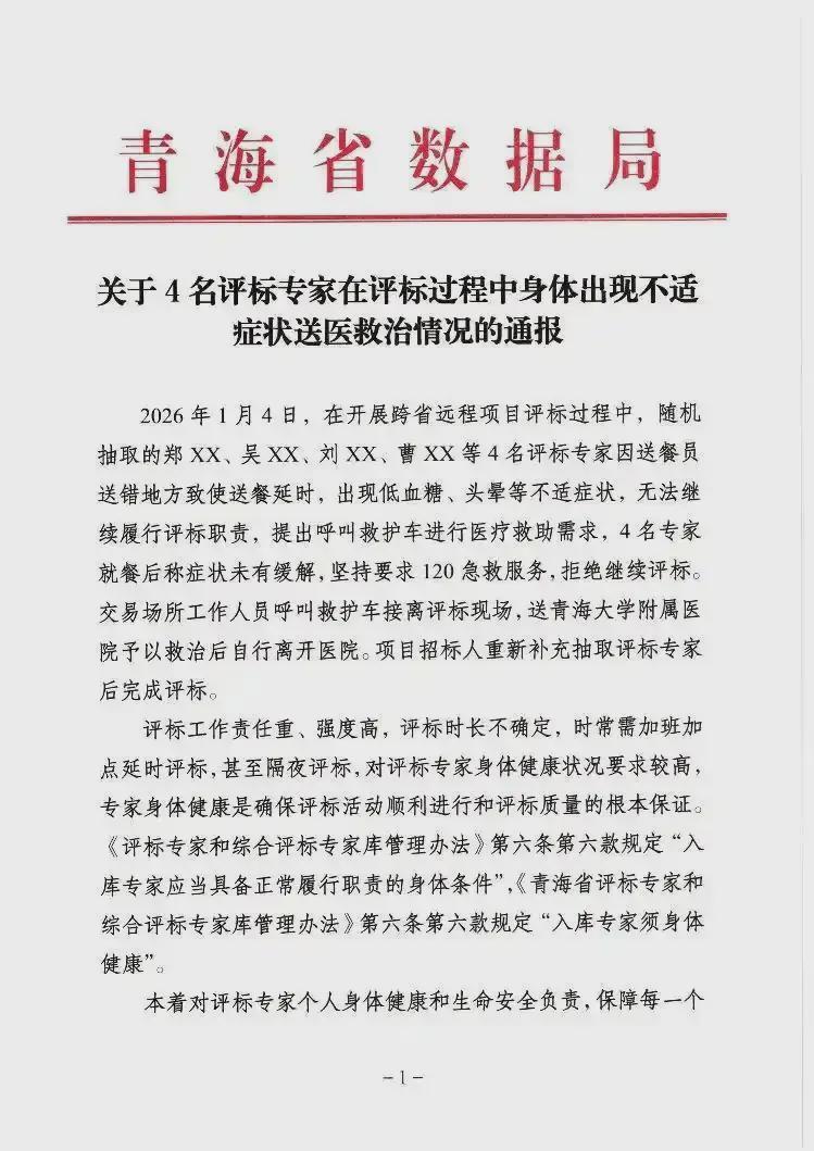 近日,青海省数据局的一纸通报,让四名评标专家因送餐延误打120的事,冲上热搜。